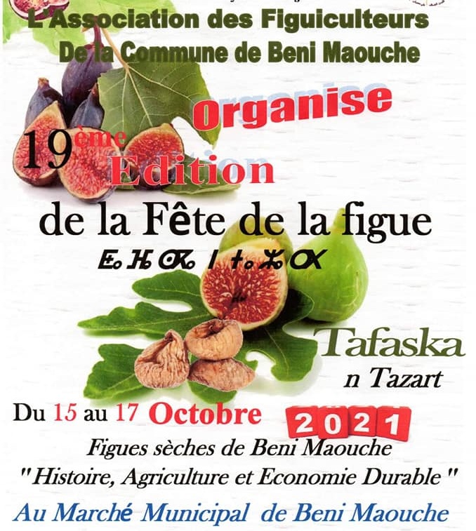 L'Association des figuiculteurs de la commune de beni maouche organise la 19 ème édition de la fête de la figue du 15 ou 17 octobre 2021 au marché municipale de beni maouche sous le thème: figues sèches de beni maouche 'Histoire, Agriculture et économie durable'.