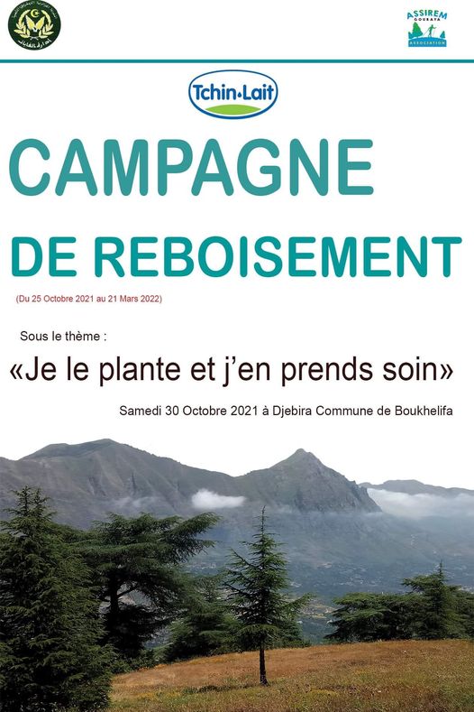 Cette opération s’inscrit dans le cadre de la campagne nationale de reboisement sous le thème < je le plante et j`en prends soin > , l'action de reboisement aura lieu ce samedi 30 Octobre 2021 à Djebira avec la contribution de la Spa Tchin-lait qui veille à mobiliser les moyens matériels et humains pour concourir à sa réussite.