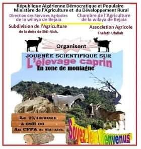 Une journée scientifique sur "l'Élevage caprin en zône de montagne " et ce, le jeudi 09 Décembre 2021 à partir de 09 heures au CFPA de Sidi Aich.