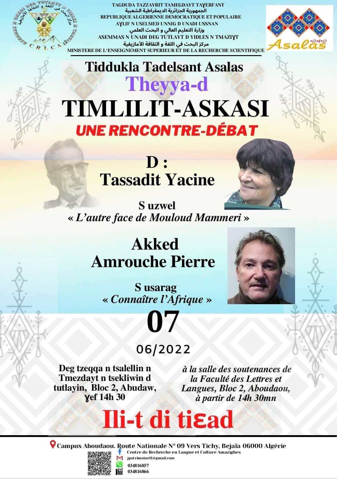 Association culturelle du centre de recherche en langue et culture Amazighes organise une rencontre - débat avec docteur Tassadit Yacine et Amrouche Pierre ,a la salle des soutenances de la faculté des lettres et langues , ou bloc 2 Aboudaou ,le 07 juin 2022 a partir de 14h30