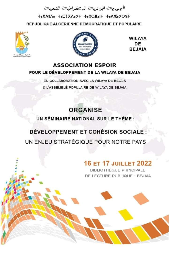 Association espoir pour le développement de la wilaya de Béjaïa en collaboration avec la wilaya de Béjaïa et l'assemblée populaire de la wilaya de Béjaïa organise le 16 et 17 juillet 2022 un séminaire national sur le thème : développement et cohésion sociale : un enjeu stratégique pour notre pays a la bibliothèque principale de lecture publique bejaia