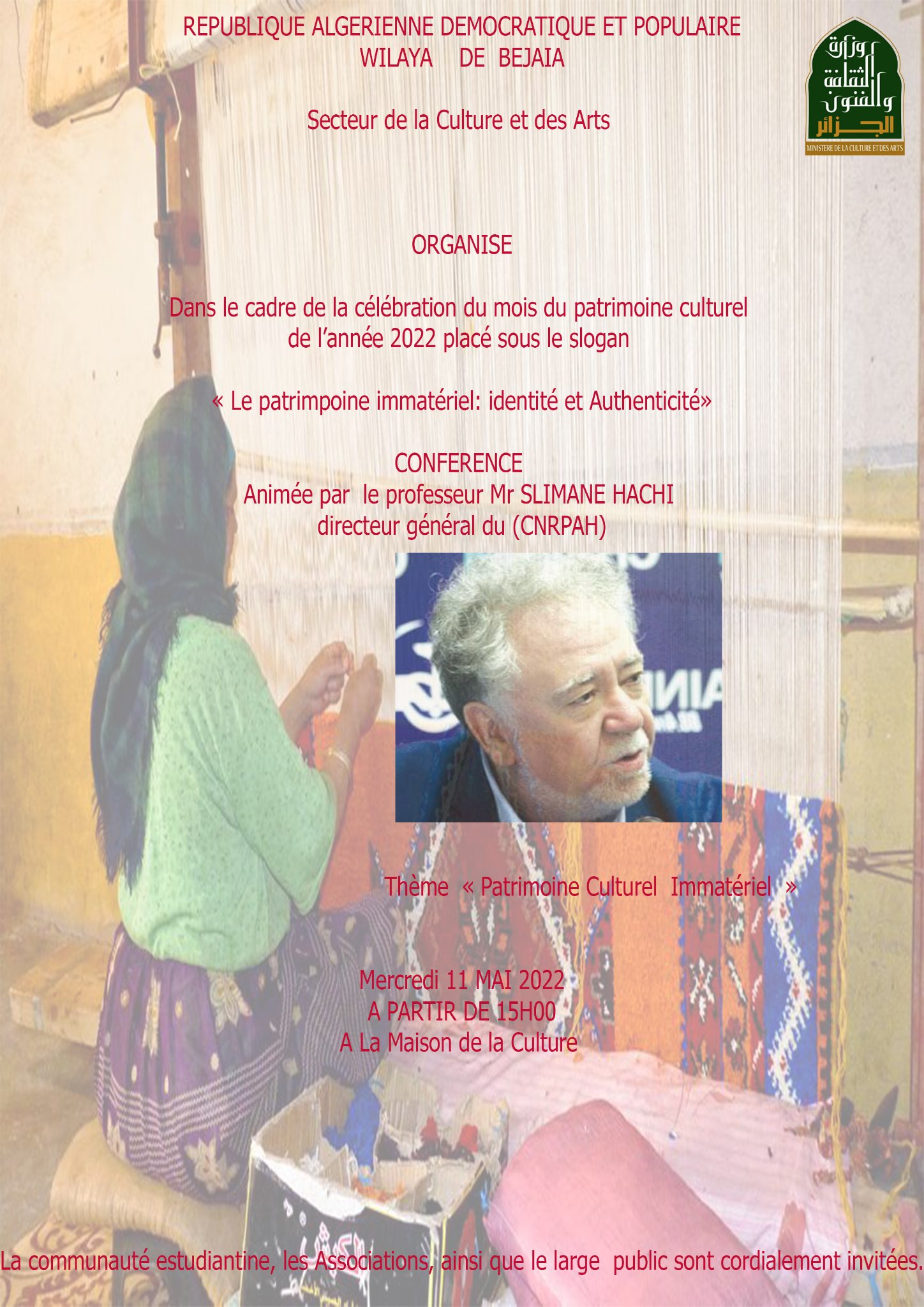 11 Mai 2022 à 15h00 : Maison de la Culture de Bejaia. Conférence débat animée par le professeur SLIMANE HACHI directeur général du (CNRPAH), thématique " patrimoine Culturel Immatériel ".