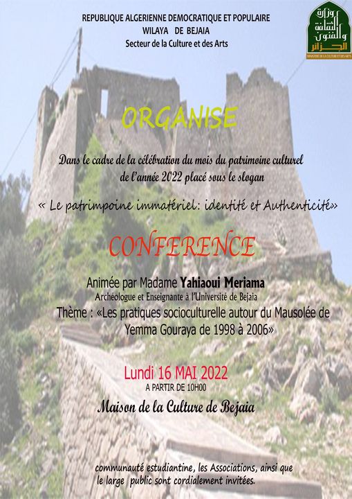le 16 Mai 2022 à 10h00 : Maison de la Culture de Bejaia. Conférence débat animée par Madame Yahiaoui Meriama Archéologue et Enseignante à l'Université de Bejaia, thématique "Les pratiques socioculturelles autour du Mausolée de Yemma Gouraya de 1998 à 2006".